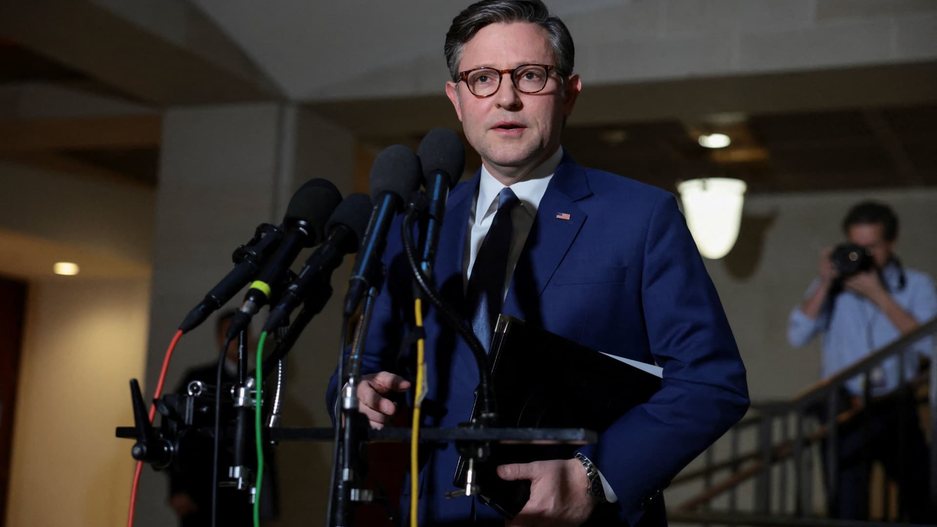 House Speaker Mike Johnson (R-LA) speaks to the media ahead of a secure briefing about U.S. action in Venezuela, on Capitol Hill in Washington,, D.C., U.S., Jan. 5, 2026.