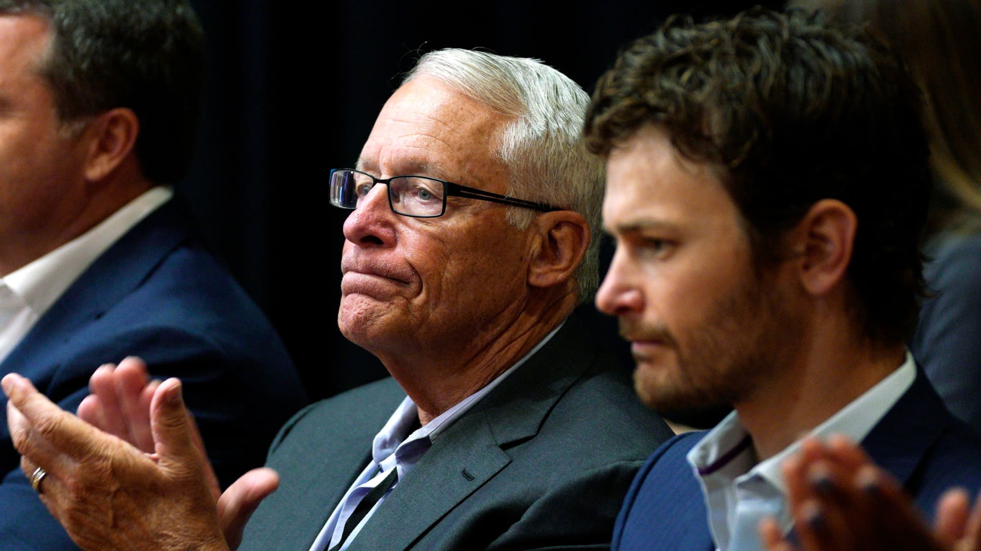 Rob Walton, left, Walmart retired chairman of the board, and Walmart board member Steuart Walton listen at the Walmart annual formal business and shareholders meeting in Rogers, Arkansas, on May 30, 2018. Walmart shareholders from around the world can attend meetings throughout the week.