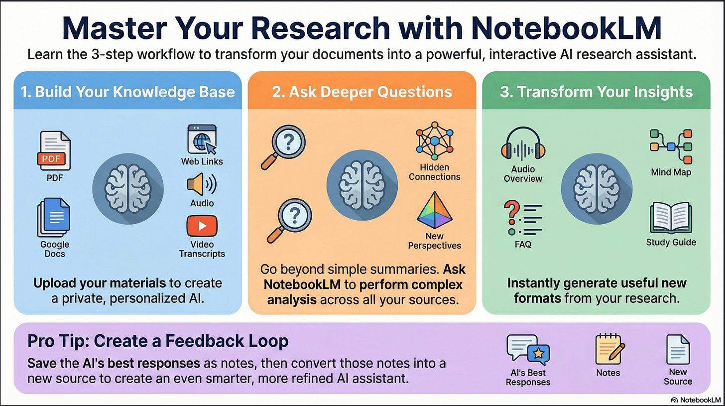 NotebookLM is the most useful free AI tool of 2025. It has twin superpowers. You can use it to find, analyze, and search through a collection of documents, notes, links, or files. You can then use NotebookLM to visualize your material as a slide deck, infographic, report — even an audio or video summary.Subscribe